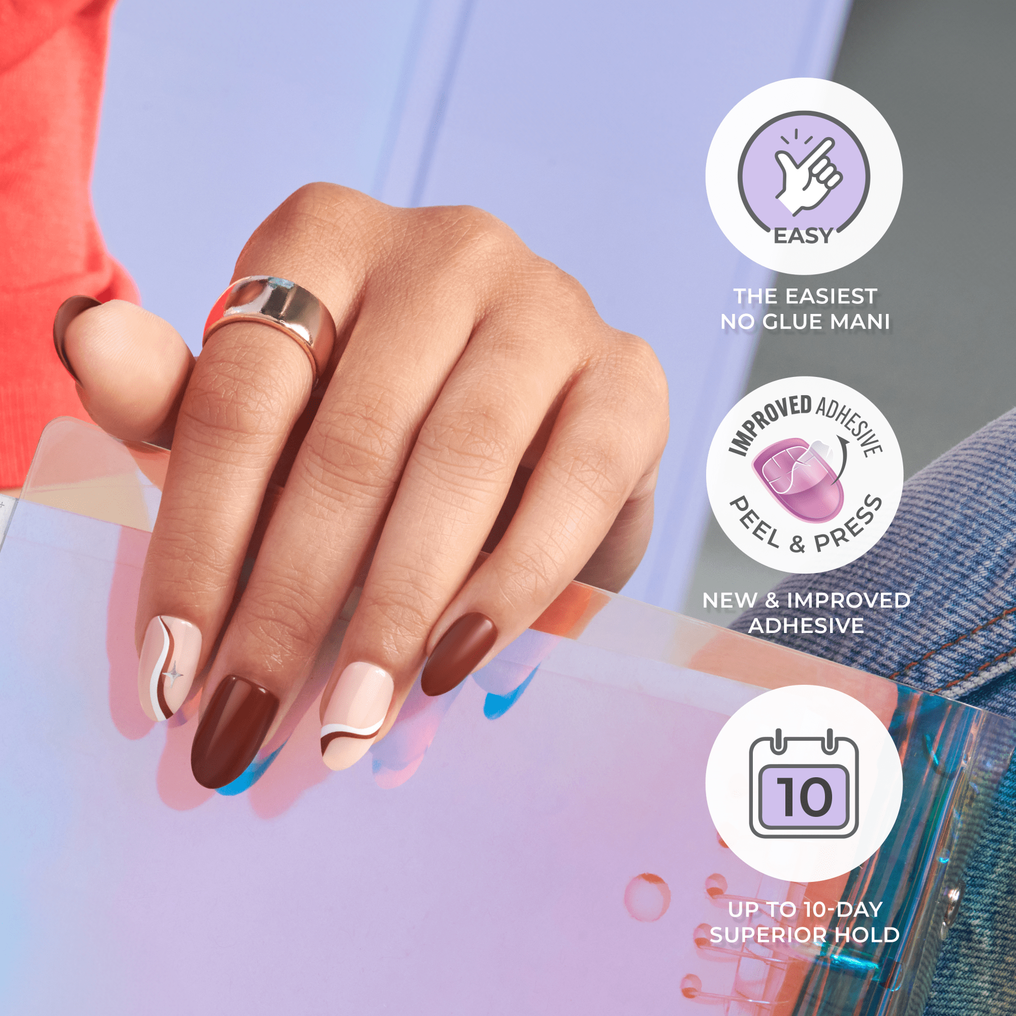 - The NO GLUE instant mani with no damage to natural nails