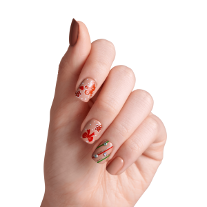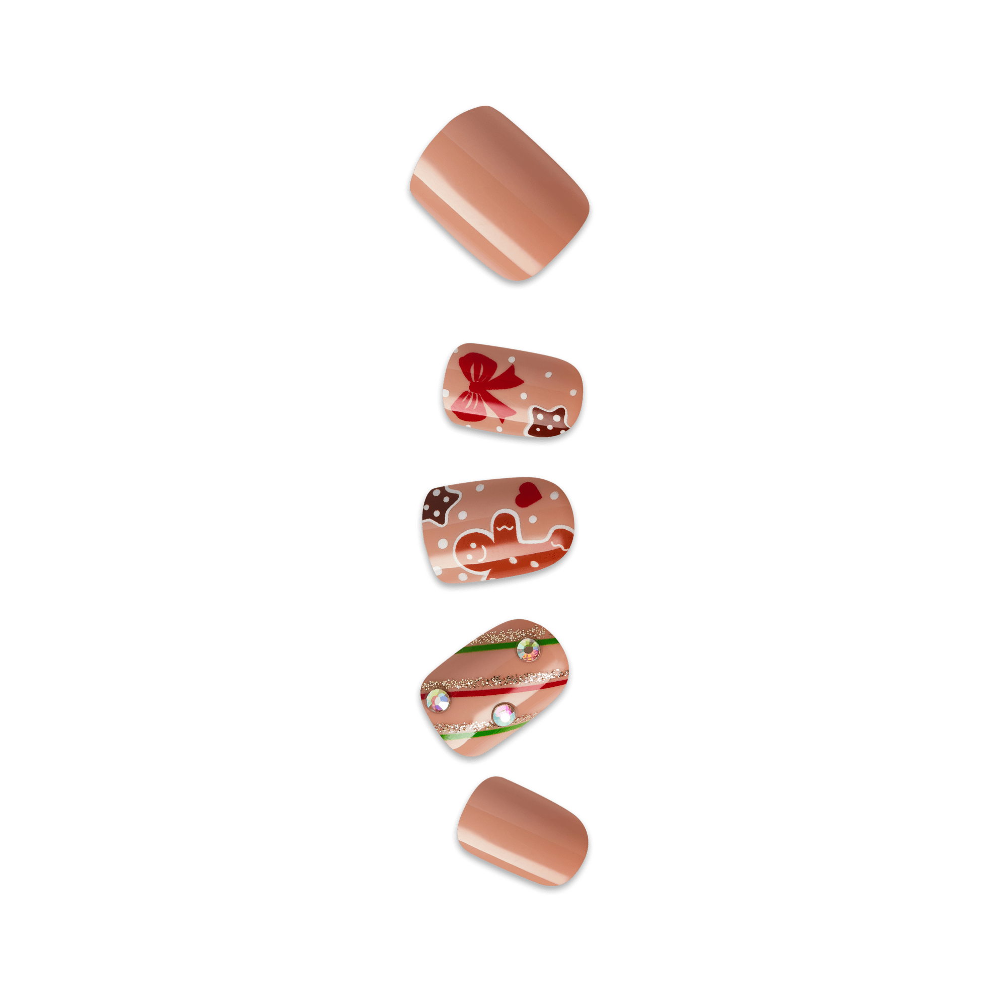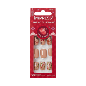Chic and timeless. ‘Mistletoe Kiss’ features short light brown squoval nails with gems and sparkles for a sleek holiday mani that feels modern yet cozy. With IMPROVED adhesive. these comfy no glue press-ons stay perfect through 10 days of wear.