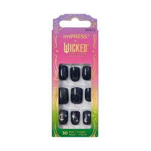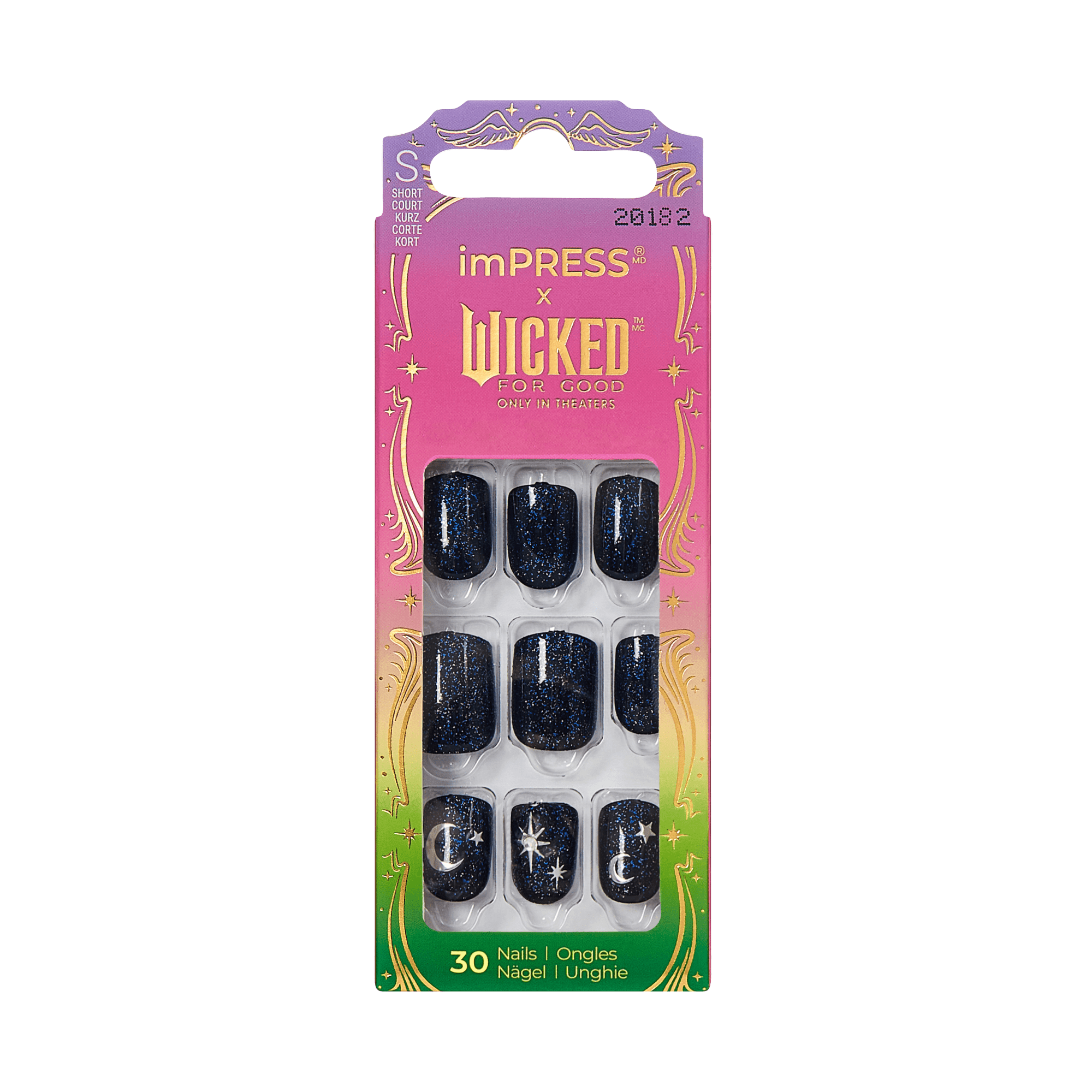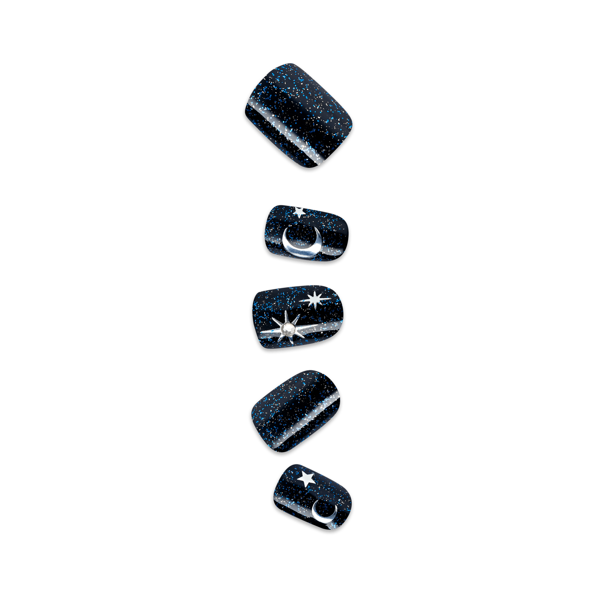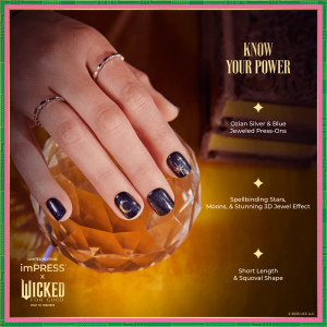 Ozian silver and dark blue press on nails feature spellbinding stars. moons. and a stunning 3D jewel effect. Know your power with the easiest NO GLUE instant mani from the imPRESS x Wicked Collection!