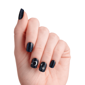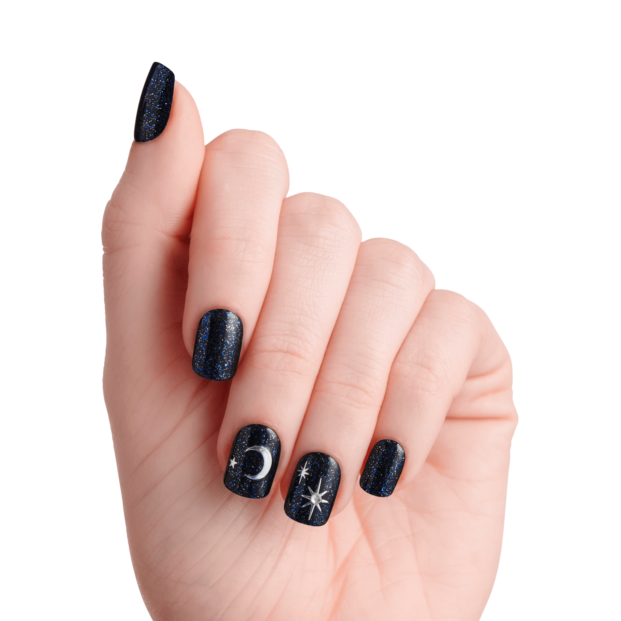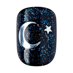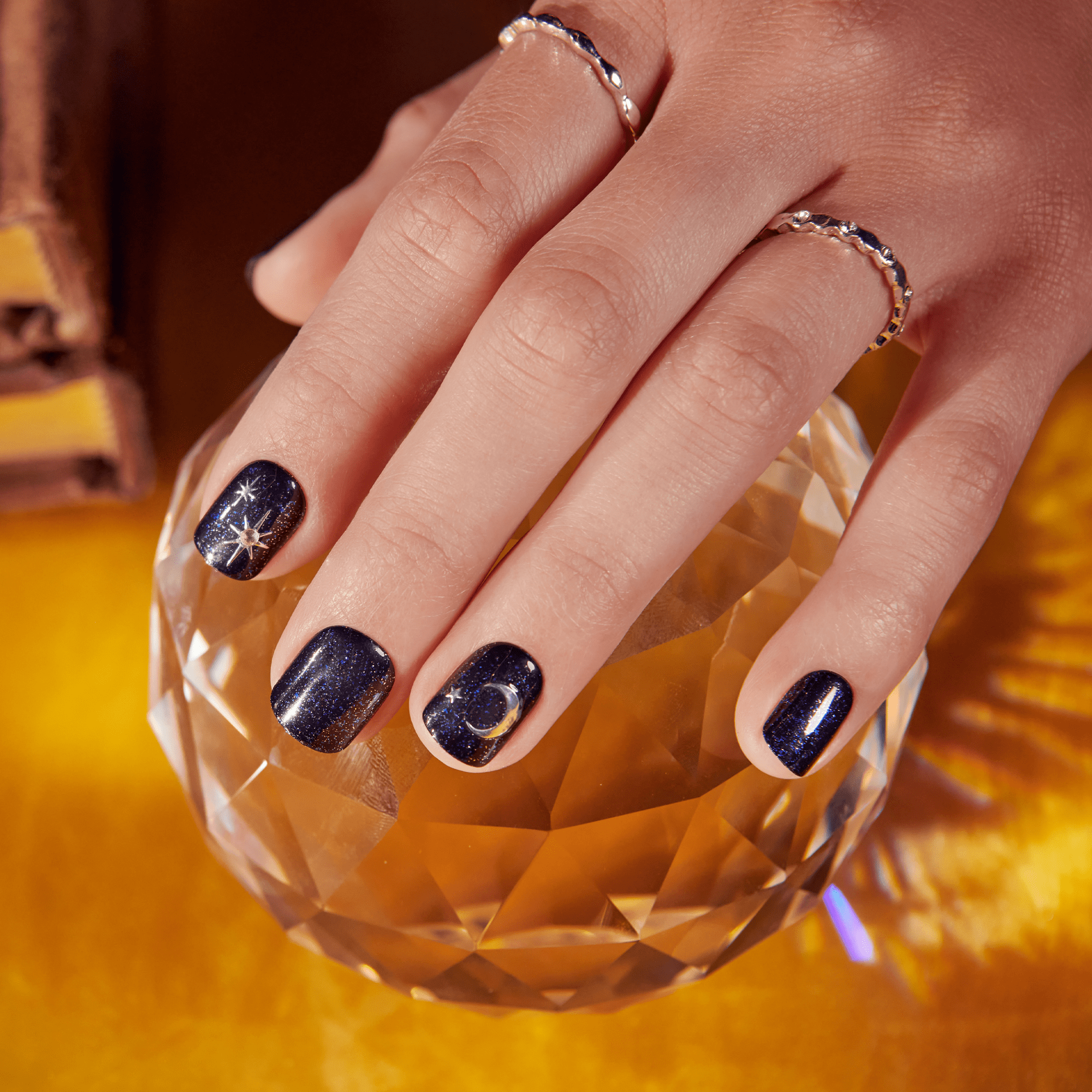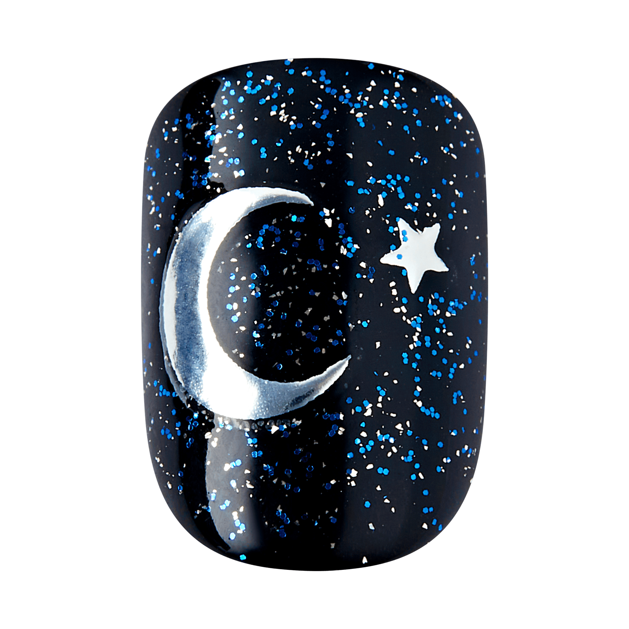 Ozian silver and dark blue press on nails feature spellbinding stars. moons. and a stunning 3D jewel effect. Know your power with the easiest NO GLUE instant mani from the imPRESS x Wicked Collection!