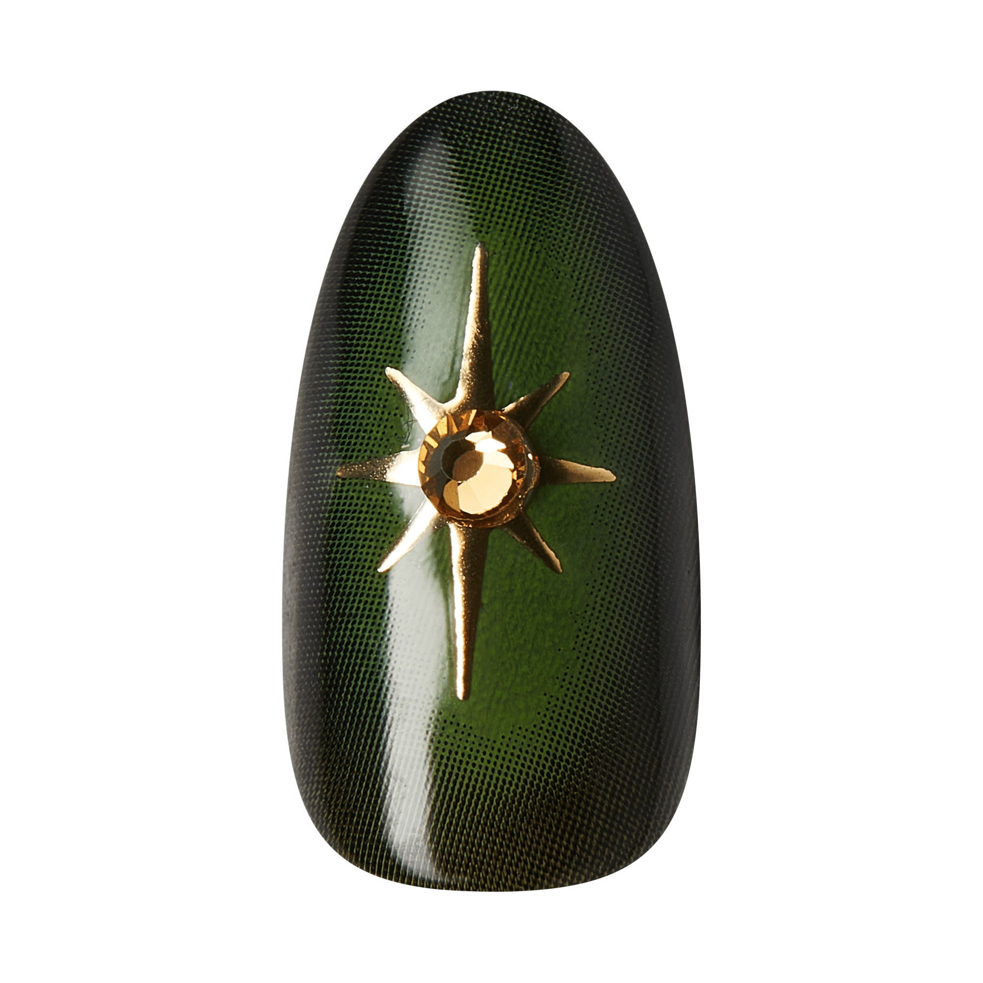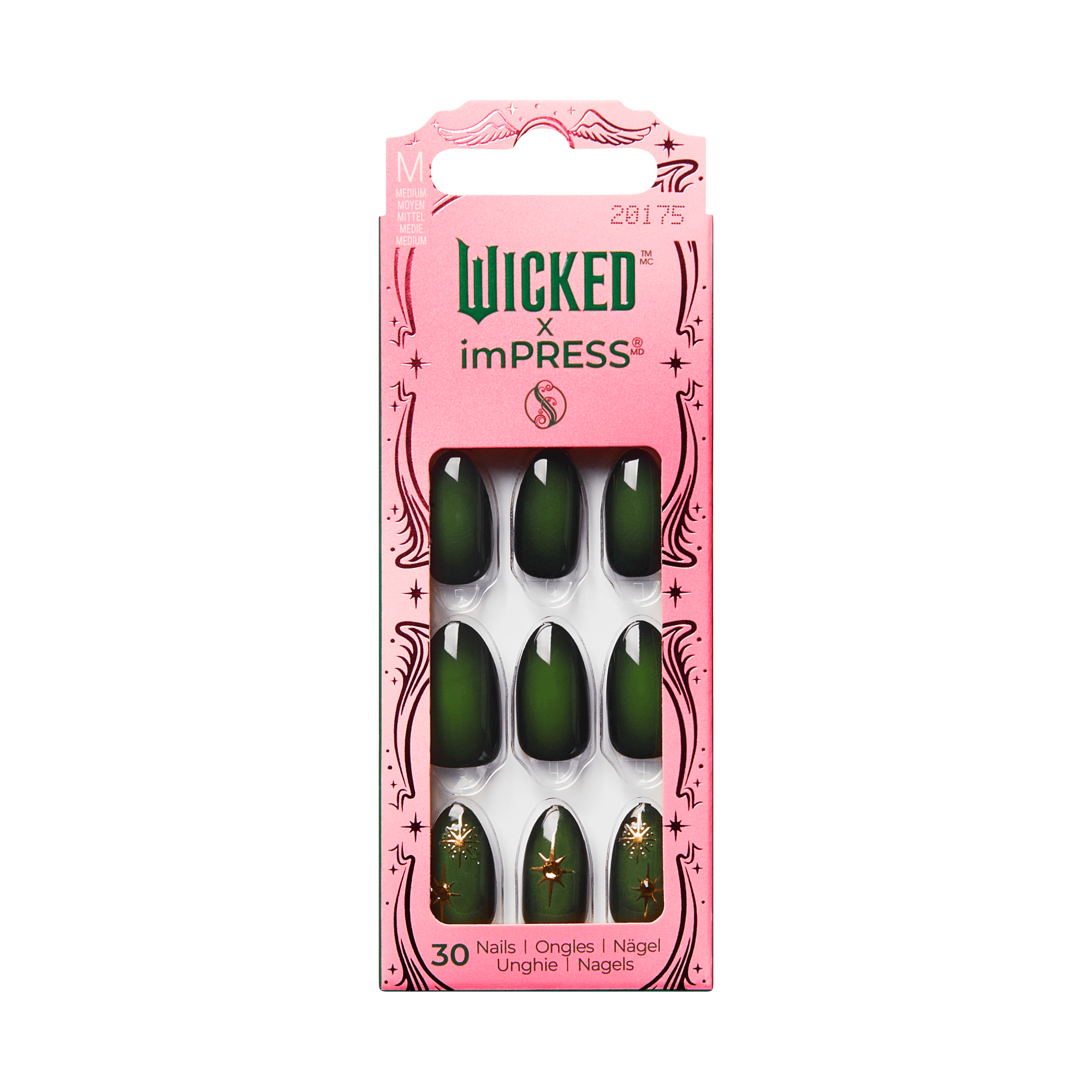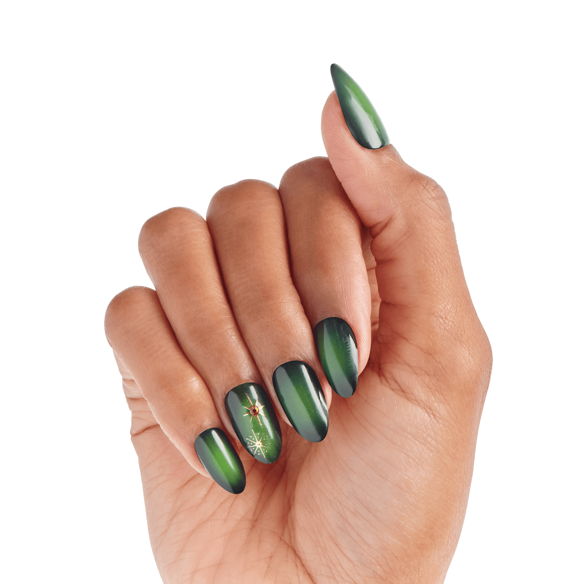 Black is this year’s pink with these green and black NO GLUE press on nails inspired by ‘Elphaba Thropp’ from ‘Wicked’. Unlock the magic within with this nail art that combines gel polish with flocking powder to create a splendiforous 3D effect.