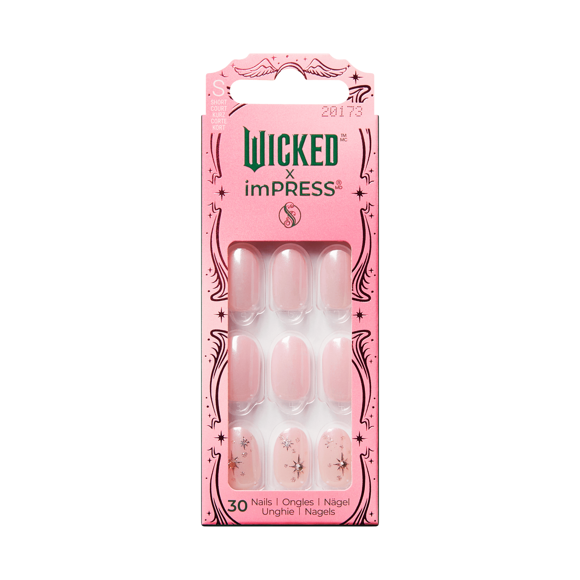You’ll be ‘Floating Over Oz with these thrillifying NO GLUE press on nails inspired by the movie. ‘Wicked’. Become the best witch of all in these perfectly pink solids featuring a spellbinding star design with 3D stones and a magical chrome effect.